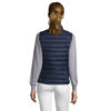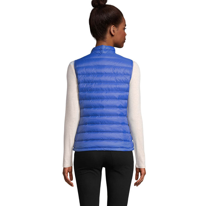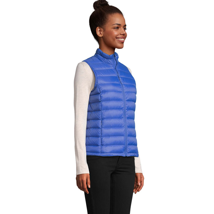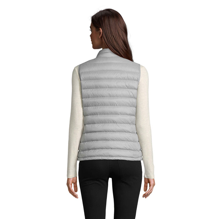 SOL'S WILSON BW WOMEN. Damska lekka puchowa kamizelka. Materiał zewnętrzny i podszewka: 100% poliamid. Wyściełanie: 60% Sorona, 40% poliester z recyklingu. POLIAMID 380T, zapinana zamkiem błyskawicznym, 2 przednie kieszenie na zamek błyskawiczny, 2 kieszenie wewnętrzne. Mały wysoki, kołnierz, dopasowany krój, system składania ''In bag'' ze stoperami. OEKO-TEX®. Sprzedawana tylko z nadrukiem.